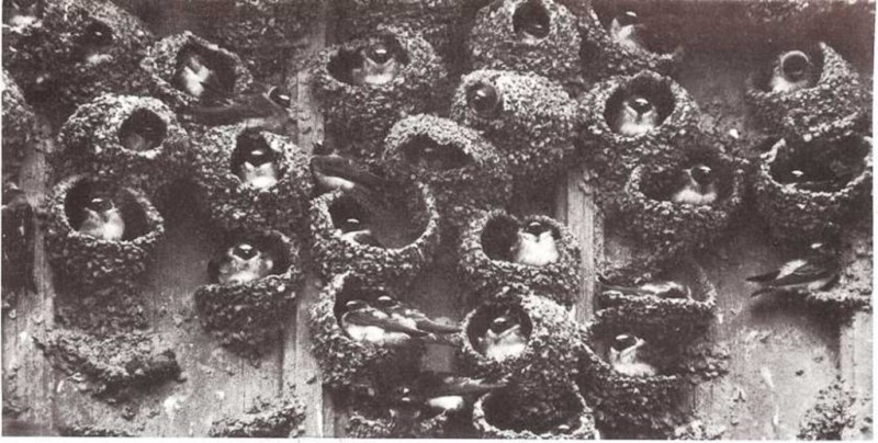Las golondrinas de los graneros o golondrinas comunes hacen nidos como cazos redondos de barro y paja. Los patos hacen montones de hierba sobre el suelo y los cubren con plumas que arrancan de su propio cuerpo. Los pájaros horneros hacen nidos en forma de cúpula con hojas y hierbas. Los nidos tienen la forma de hornos antiguos. El pájaro hornero se llama así por el tipo de nido que hace.