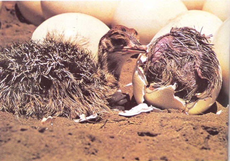 Avestruces La cría de avestruz de la izquierda hace varios minutos que ha salido del huevo. Sus plumas se empiezan a secar. La otra cría está rompiendo el huevo. Muy pronto terminará de salir. |