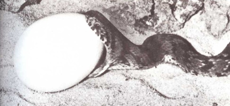 El huevo entra en la garganta de la serpiente. Un hueso de su garganta romperá la cáscara. Luego, la serpiente arrojará los restos.