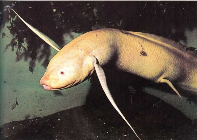 Este pez se ahogaría si estuviera demasiado rato en el agua. Tiene que asomarse a la superficie del agua, de cuando en cuando, para respirar aire. A veces sale del agua y se pasea por la tierra, remando con sus aletas. |