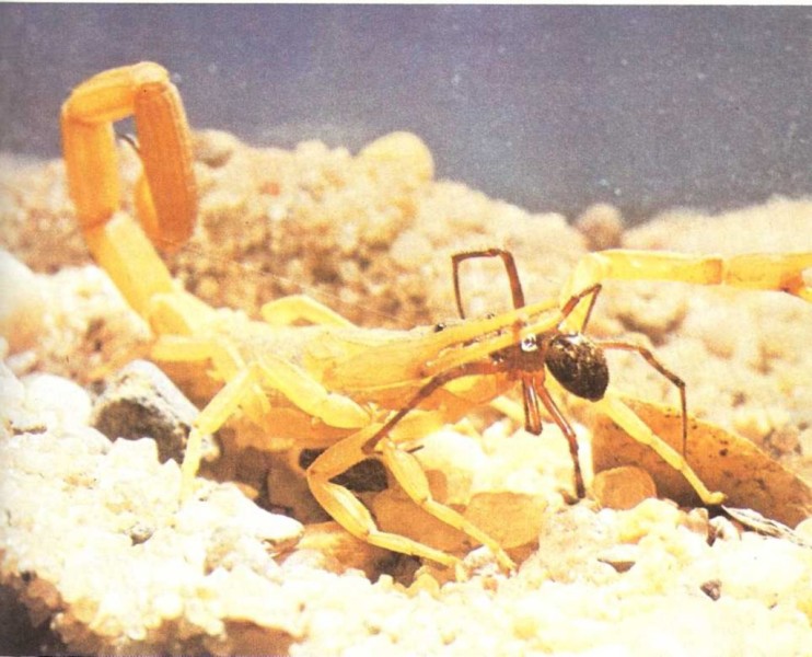La araña, corriendo sobre la arena, tropieza con un escorpión. El escorpión es el enemigo natural de la araña. Con sus garras delanteras el escorpión atenaza a la araña y le clava la punta de su larga cola. Entonces el escorpión empieza a comerse a la araña.