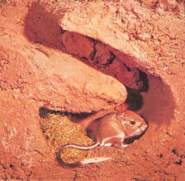 La rata canguro vive en el desierto. Estas ratas nunca beben agua. Durante el caluroso día permanecen en sus frescas madrigueras subterráneas.