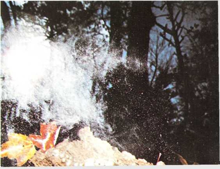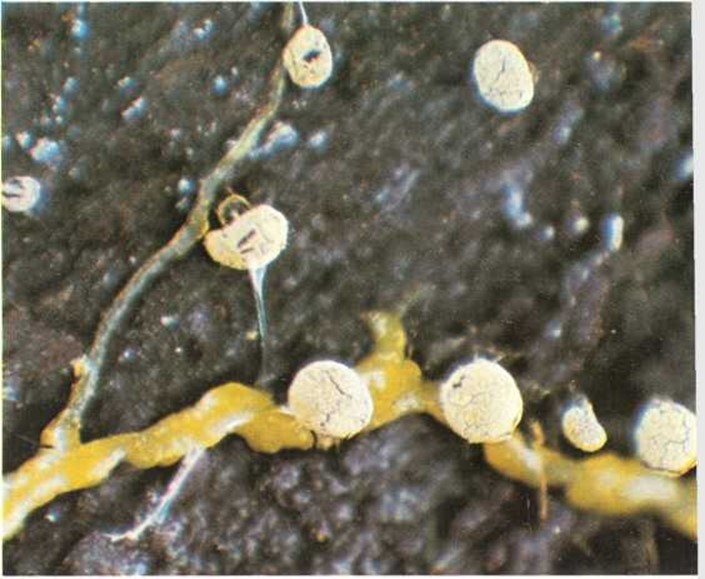 Las bolas se abren. Una nube de esporas salta al aire. De las esporas saldrán pequeñas criaturas que se multiplicarán y unirán para formar otra vez el mixomicete.