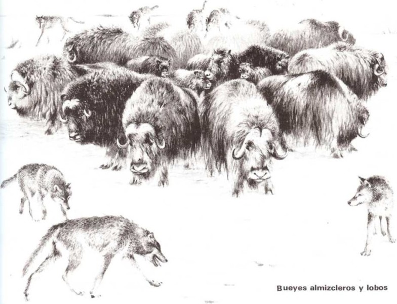 Cuando los bueyes almizcleros del Canadá, grandes y peludos, son atacados por los lobos, forman un círculo encerrando en él a sus crías. Los bueyes quedan con la cabeza baja mirando a los lobos y amenazándoles con sus largos cuernos. Los lobos aúllan, pero no se atreven a atacar. Mientras los bueyes almizcleros están en círculo, toda la manada está a salvo.