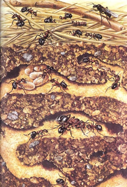 El dibujo de la página siguiente muestra un nido de hormigas rojas. Las hormigas caminan de un lado a otro. En la superficie un grupo de obreras busca comida. La hormiga alada es un macho. Las hormigas machos no hacen ningún tipo de trabajo.
