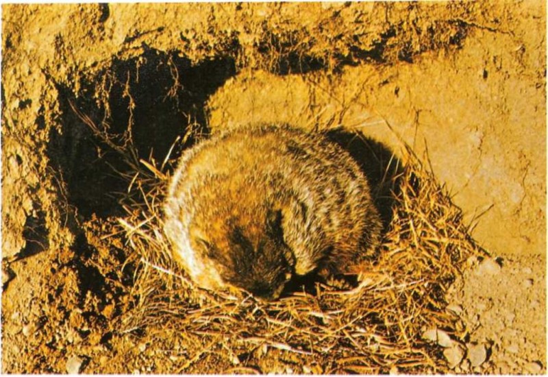 En otoño, la marmota se enrolla formando una bola en su casa subterránea y se pone a dormir. Duerme durante todo el invierno.
