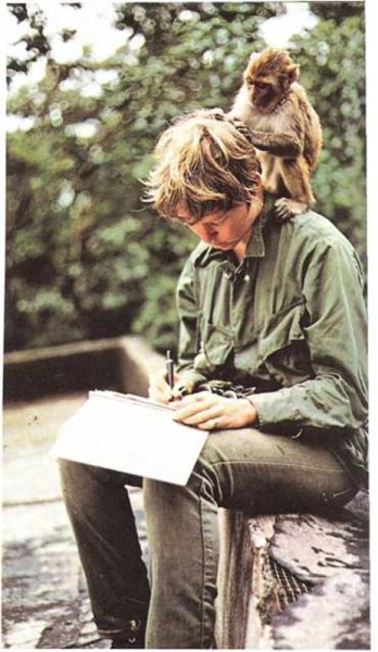 A este estudiante de zoología le interesan los animales de las montañas de la India. El mono rhesus parece estar estudiando al estudiante. |