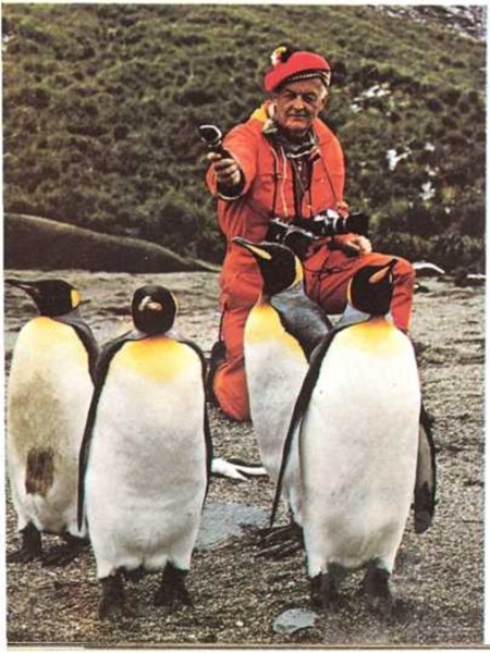 Roger Tory Peterson es un artista y fotógrafo que estudia las aves. Aquí está grabando las voces de los pingüinos reales.