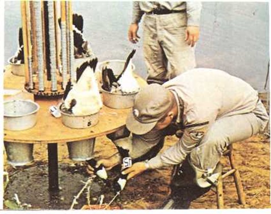 Este biólogo pone cintas numeradas en el cuello de estas barnaclas canadienses. Por medio de estas cintas, los científicos podrán estudiar al animal cuando esté en libertad. |