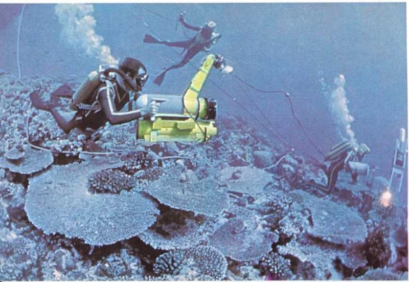 El equipo de Jacques Cousteau toma fotografías bajo el agua. Aquí están a veinte metros de profundidad.