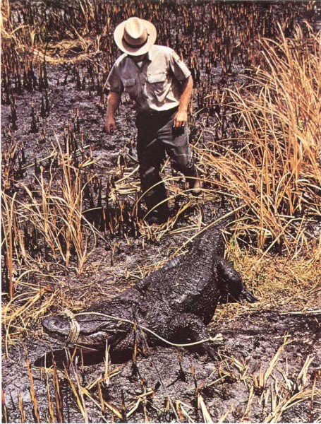 El guarda va a poner una etiqueta al caimán. Se marca a los animales para contarlos más fácilmente. |