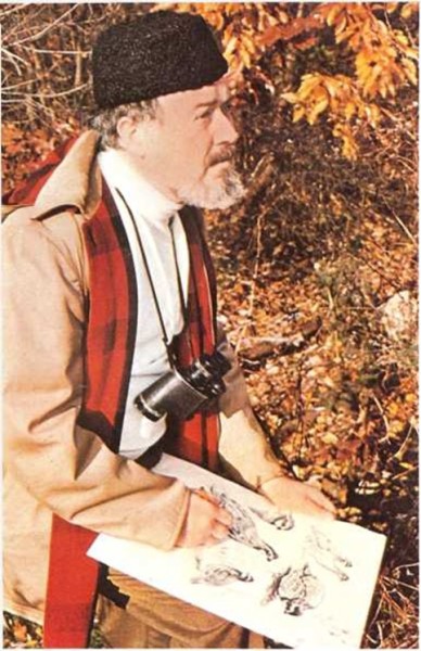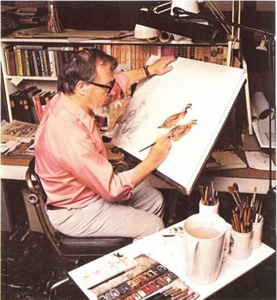 El pintor Don Eckelberry pasa muchas horas en los bosques mirando las aves que quiere pintar. Hace rápidos dibujos de todo lo que ve. Luego, va a su estudio y empieza a pintar, valiéndose de los apuntes que ha tomado al natural.