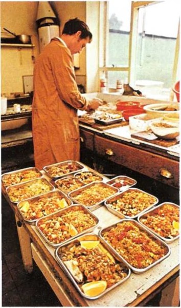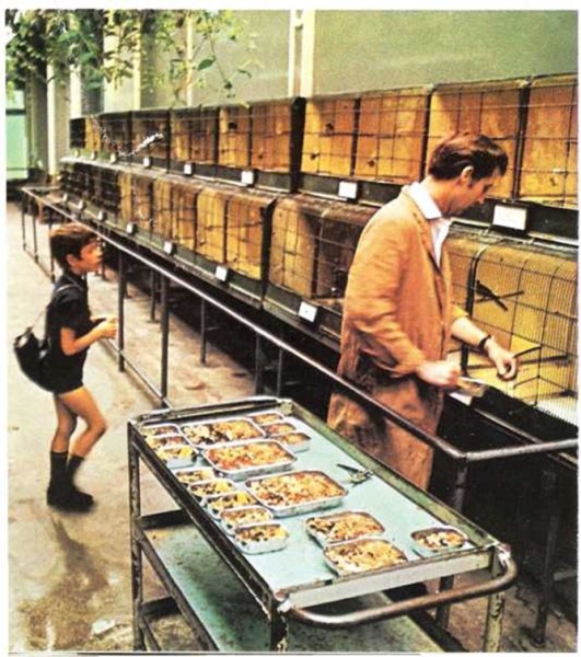 Cada jaula recibe su bandeja de comida. Así, las aves reciben exactamente la cantidad de comida necesaria para mantenerse sanas.