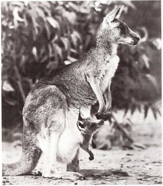 A los diez meses de haber nacido, un pequeño canguro llega a ser mayor que la bolsa de su madre. Entonces va saltando al lado de su madre y permanece con ella hasta que tiene 18 meses.