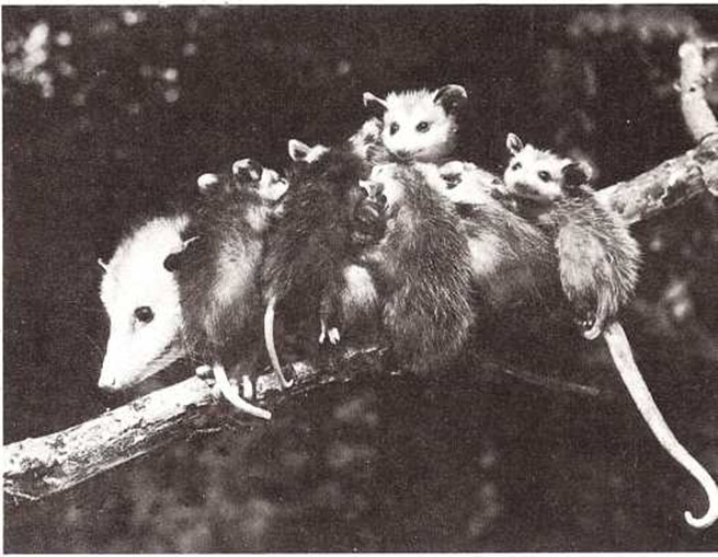 La zarigüeya hace montar sobre ella a todas sus crías. |