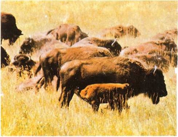 El joven bisonte también bebe leche. Cuando se hace mayor, sólo come hierba. |
