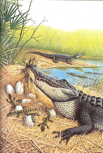 Un aligator americano se arrastra entre arbustos espinosos y los aparta con las patas y la boca. Pronto deja un espacio amplio y limpio. En él hace un montón de barro y plantas. En un hueco de la cima del montón pone, por lo menos, cincuenta huevos. Después, cubre los huevos con barro y plantas.