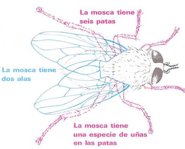 La mosca es uno de los animales de seis patas a los que llamamos insectos. Las moscas, hormigas, abejas, saltamontes, escarabajos, grillos y mariposas son insectos. Todos ellos tienen seis patas.