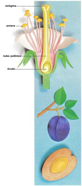 Cuando el polen llega al estigma de la flor, se forma un tubo que alcanza al óvulo. Allí se une con un huevo para dar lugar a una semilla. Alrededor de la semilla se forma el fruto. |