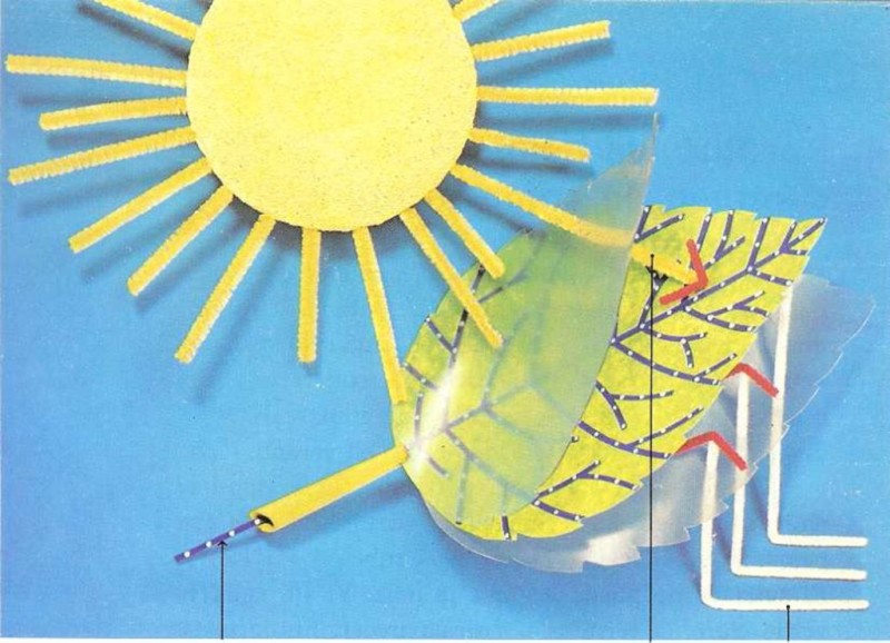 La luz del sol atraviesa la superficie transparente de la hoja. El aire le llega por unos pequeños agujeros que parecen bocas. El agua penetra por unos tubos que hay en el tallo. Gracias a la potencia de la luz solar, la clorofila de la hoja transforma el aire y el agua en alimentos para la planta. |