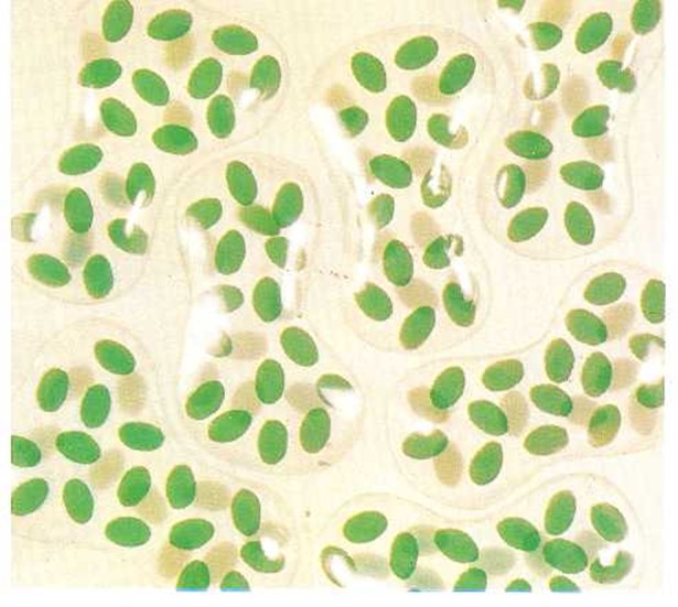 La luz del sol penetra en las hojas a través de su piel, que es transparente como un cristal. Bajo la piel hay millones de pequeños «sacos» llamados células. Estas células son como diminutas pelotas llenas de agua y de gelatina viviente. Dentro de las células hay unos paquetitos verdes llamados cloroplastos. Los cloroplastos son verdes porque están llenos de una sustancia verde llamada clorofila. La clorofila recoge parte de la luz que llega a la hoja.