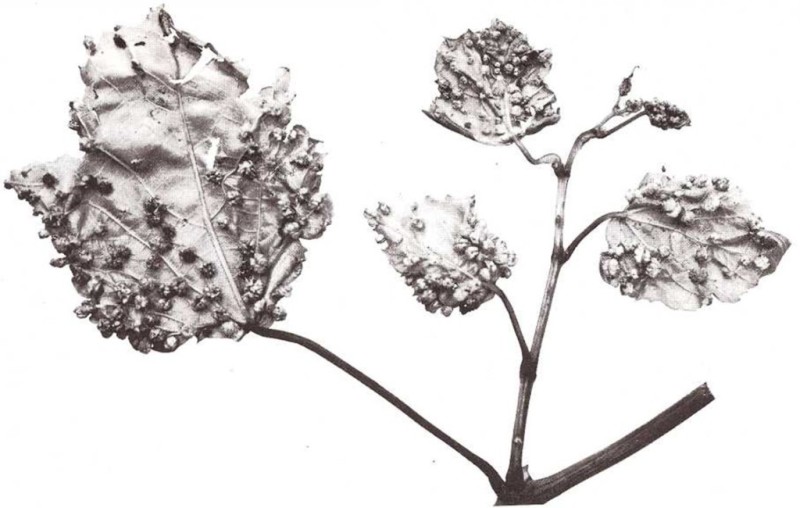 Agallas de insecto en hojas de vid Cuando los insectos ponen sus huevos en las hojas, se forman unos pequeños bultos, llamados agallas, que recubren a los huevos. |