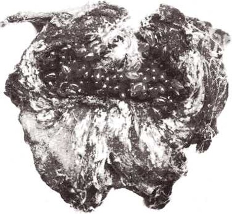 Agalla de insecto abierta Los insectos jóvenes que salen de los huevos aprovechan la parte interior de la agalla como alimento. |
