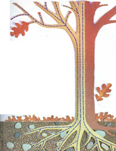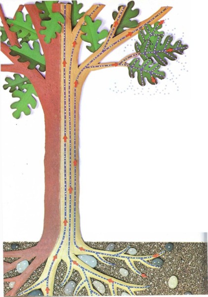 Las hojas elaboran el alimento que necesitan las plantas para vivir. Pero para elaborar alimento, y poder vivir ellas mismas, las hojas necesitan agua. Las raíces del árbol recogen agua del suelo y la envían a las hojas por el tronco.