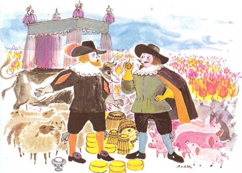 Los precios de los bulbos de tulipán crecieron y crecieron. Algunas personas llegaron a vender sus casas para comprar bulbos de tulipán y volver a venderlos. Se cambiaban cosas valiosas por bulbos de tulipán. ¡Un bulbo se vendió por 4 vacas, 8 cerdos, 12 ovejas, 2 barriles de manteca, 1.000 libras de queso, 2 barriles grandes de vino, 4 barriles de cerveza, 2 carros de trigo, una cama, un juego de vestidos y una gran copa de platal