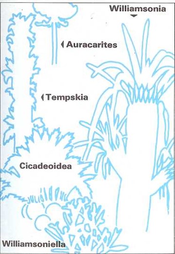 Las coníferas son árboles que tienen conos, como los pinos y los abetos. Las cicadáceas se parecen un poco a una pina americana, con un círculo de plumas saliendo de su punta. En otro tiempo, las cicadáceas eran muy comunes, pero en la actualidad sólo viven en algunas partes cálidas del mundo.