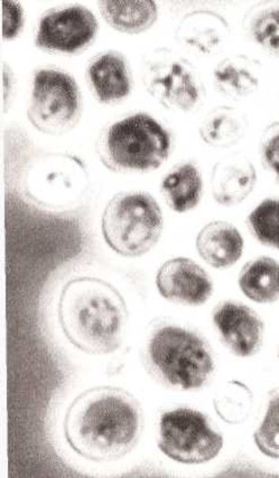 He aquí lo que sucede. Cuando la levadura toma alimento, se hincha y se divide en dos nuevas plantas.