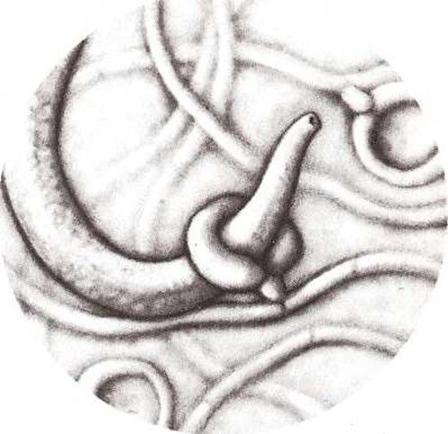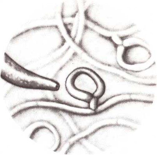 Pequeños gusanos, no mayores que estos filamentos, se arrastran a través de la tierra. Cuando un gusano pasa por uno de los lazos, éste se cierra. El gusano está preso. Entonces, el hongo empieza a digerirlo.