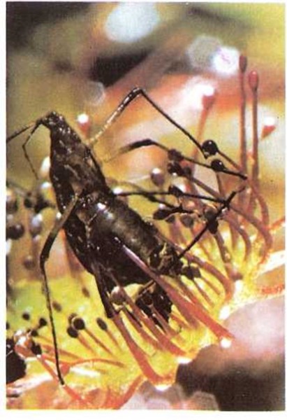 Las plantas pueden atrapar insectos de diversas maneras. La planta llamada drosera tiene las hojas cubiertas de pequeños pelos. En cada pelo hay una gota de un líquido pegajoso. El sol se refleja en estas gotas y atrae a los insectos. Pero cuando un insecto toca una gota, queda adherido a ella. Entonces, todos los pelos que están alrededor del insecto se doblan lentamente sobre él. Aprietan al insecto contra la hoja. De la hoja rezuma un jugo que digiere al insecto lentamente.