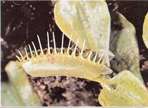 La planta llamada dionea, y también atrapamoscas, se comporta como una trampa. Tiene pequeños pelos, como gatillos, en cada hoja. Junto al borde de la hoja hay unas pequeñas «garras». ¡Y cada hoja puede plegarse por la mitad! Cuando la mosca u otro insecto se posa en una hoja y toca uno de los gatillos del pelo, la hoja se pliega rápidamente. Las pequeñas «garras» se cierran. El insecto está atrapado. Luego, la planta lo digiere.