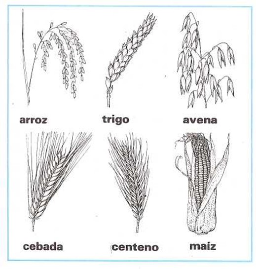 Cuando hablamos de hierba, generalmente pensamos en prados verdes. Pero hay muchas clases de hierba. El trigo, la avena, el centeno, la cebada, el arroz y el maíz son hierbas. Estas hierbas se llaman cereales. Sus frutos, comestibles, son los granos.