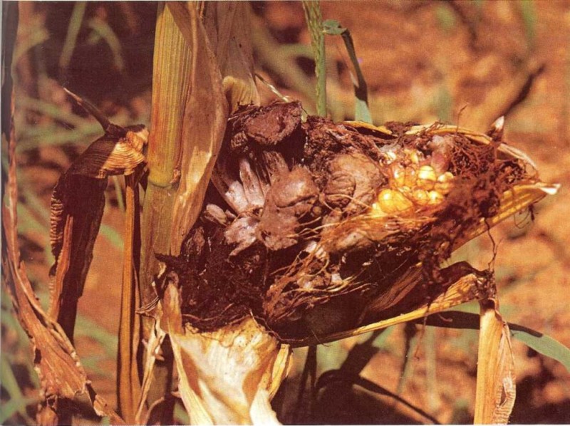 El tizón es una pequeña planta de la clase de los hongos. Muchas de estas plantas crecen a veces sobre el maíz, pudriéndolo y causándole la muerte. |