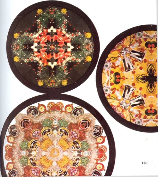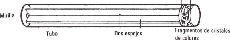 | Cuando la luz penetra en el calidoscopio y atraviesa los discos de cristal, choca contra los cristales de colores. Después se refleja en los espejos y salta de uno a otro, atrás y adelante, atrás y adelante, hasta que llega a la mirilla. A cada salto aumenta el número de imágenes de cada fragmento de cristal. |