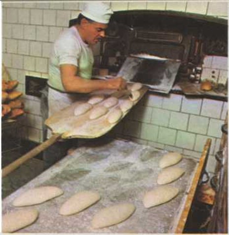 Estas piezas se dejan sobre unos estantes o tablas, con objeto de que continúen fermentando, y se introducen al cabo de un rato en el homo. En el interior de este homo no podrías resistir el calor, pues hay una temperatura de unos 225 grados, o sea, más de seis veces superior a la de tu cuerpo. Las piezas de masa permanecen en el homo durante unos veinticinco minutos y seguidamente se sacan convertidas en bollos o barras de pan tierno y crujiente.