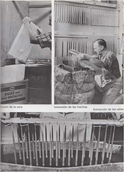 Para fabricar una vela se coge un cordón de hilo o algodón y se sumerge en un bote de cera fundida. Se sumerge una, dos, tres y muchas más veces, y el cordón, mecha o pabilo se cubre de una espesa capa de cera. La capa de cera que se forma alrededor del cordón es una vela, bujía o candela. Si se desea fabricar otra clase de velas, la cera líquida se va vertiendo en moldes de formas caprichosas o que representan algo. Estos moldes están partidos por la mitad. Una vez que la cera se ha endurecido se unen las dos mitades iguales, después de haber introducido un cordón en el medio. Todavía se confeccionan otra clase de velas cuando se vierte la cera líquida en una máquina llena de profundos agujeros. Por el centro de cada agujero se pasa un cordón y en seguida se van llenando uno tras otro. Cuando la cera se ha endurecido, un mecanismo saca los cordones convertidos en largas velas. |