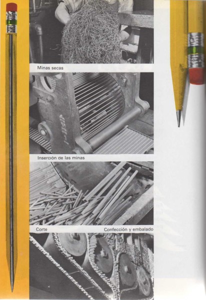 La parte del lápiz que escribe se conoce con el nombre de mina. Los fabricantes de lápices mezclan arcilla con una sustancia llamada grafito y obtienen así un polvo de aspecto semejante a la harina. Ponen esta mezcla en una máquina que tiene una placa con gran número de pequeños agujeros por los cuales sale la mezcla convertida en largos filamentos a modo de cuerdas. Estos filamentos se dejan secar en el homo. Las minas, una vez secas, se colocan en ranuras abiertas en delgados bloques de madera de igual forma y tamaño, se pone encima otro bloque igual y se encolan ambos. Por último, se hace pasar el conjunto por una máquina que los corta y los transforma en lápices nuevos y flamantes como los que usas para escribir. |