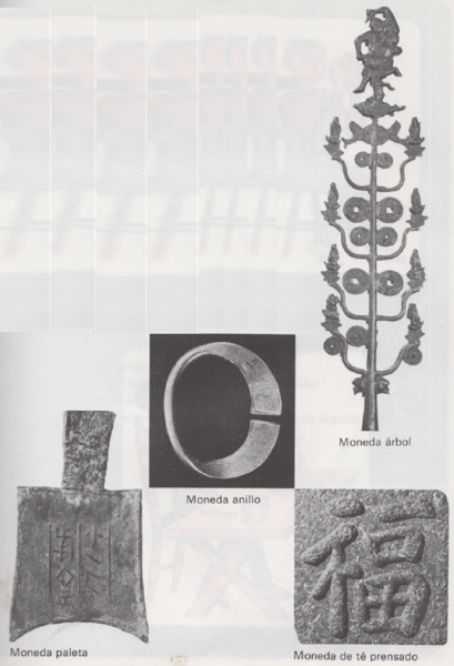 En la isla de Yap, situada en el océano Pacífico, las monedas eran unas piedras que debían llevarse ensartadas en un palo. En África se empleaban terrones de sal como monedas. En Malaca, las monedas de estaño tenían forma de árbol. Cada rama era una moneda y la gente rompía una de ellas siempre que tenía necesidad de comprar algo. En China se usaban antiguamente unas monedas de bronce que tenían forma de paleta. En Egipto, en cambio, las monedas de oro tenían forma de anillo. Aún hoy, en el Tibet se usan como dinero bloques de té prensado y mezclado con madera desmenuzada. |