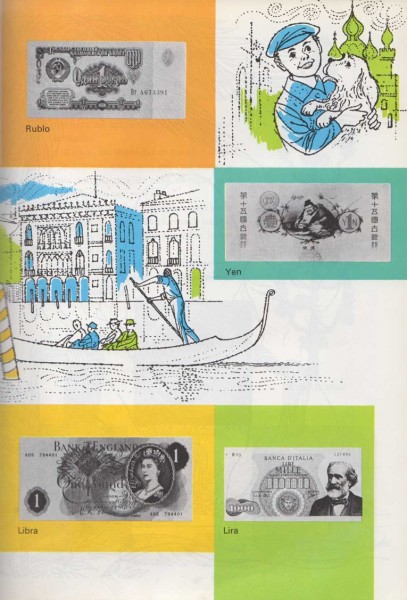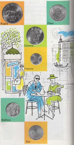 ¿Es cierto que se coge el autobús en México por un peso, o que se almuerza en Japón por unos yens? ¿Es cierto que en Inglaterra se compra una caja de soldados de plomo por una libra, o se hace un viaje en tren, en Suecia, por algunas coronas? ¿Es verdad que en Rusia se vende una muñeca por un rublo, o que en Francia se adquiere un helado por un franco? ¿Es cierto que podrías comprar un sombrero nuevo en Panamá por unos balboas, o montar una llama en Perú por un sol? Sí, es cierto, porque una rupia, una lira, un peso, un yen, una libra, una corona, un rublo, un franco, un balboa y un sol son las monedas de cada uno de esos países. |