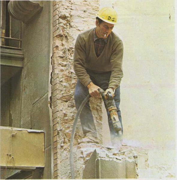 Para ello se realiza el siguiente trabajo: potentes bulldozers arremeten contra las paredes maestras del edificio y, a fuerza de golpear, las derriban. Con ellas cae lo más importante del edificio. Tras las máquinas entra en acción el hombre. Obreros especializados, valiéndose de mazos o picos mecánicos, acaban de derribar las partes salientes, trozos de pared, vigas, pilares, etc. Así, el lugar queda listo para edificar en él una nueva casa. |