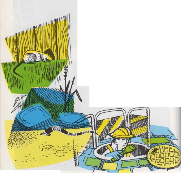 Tal vez has sorprendido a un ratón metiéndose en su escondrijo o a una lagartija desapareciendo por una hendidura. Pero, ¿no has observado alguna vez a un hombre que se introduce en un agujero abierto en plena calle? A veces, en el suelo de las calles hay un disco de hierro. Es la tapa de una alcantarilla. Debajo de ella se abre un agujero negro y profundo. Un día ves a un hombre que coloca una pequeña valla en tomo al agujero y desciende por él. El hombre enciende una linterna y aparece a su alrededor gran cantidad de tubos y cables. Son las conducciones del agua y del gas y los cables que suministran energía eléctrica desde la central a todas las casas del sector. Pero, ¿qué está haciendo aquel hombre allá abajo? Está reparando algún cable o tubo averiado o quizá trabaja realizando alguna nueva instalación. |