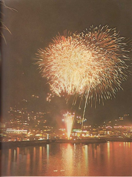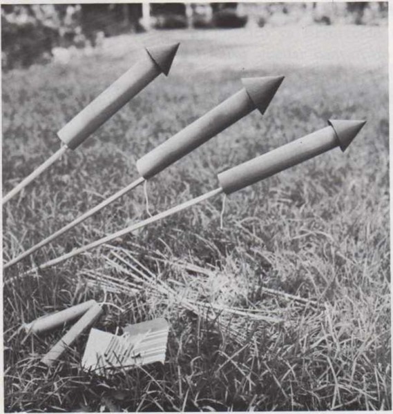 El cohete explota y esparce una lluvia de estrellas de color verde, rojo, azul y anaranjado. ¿De dónde salen esas estrellas? Antes de que salten por el aire, tales estrellas no son más que pequeños trocitos de determinados productos químicos; uno para cada color. Los fabricantes de artículos pirotécnicos introducen aquellos trocitos en tubos. Después, rellenan cada tubo con pólvora y lo encierran en una especie de proyectil con una cabeza en forma de cono, fijan una caña en el extremo opuesto y ya está dispuesto el cohete. |