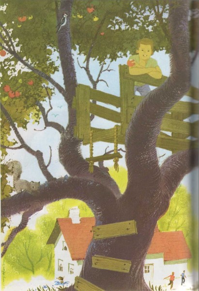 Cuando juego en mi casa del árbol puedo ser un «sheriff» que persigue a unos bandidos o un capitán en la cubierta de su barco. Cuando juego en mi casa del árbol, puedo ser un soldado que vigila al enemigo o un gigante. He construido mi casa con tablas y clavos. Aquéllas las obtuve de unos cajones viejos; los clavos los compré en la ferretería, y con el martillo de mi padre los clavé. Mi padre me ha ayudado a construir mi casa del árbol. Cuando subo a esta casa puedo convertirme en el personaje que quiero. |