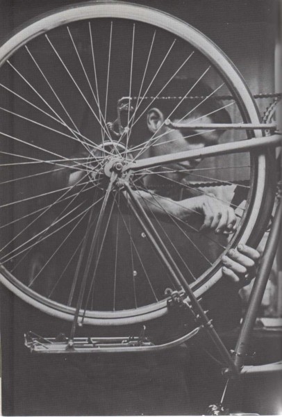 En una bicicleta parada puedes observar algo que es difícil de ver cuando la bicicleta está en movimiento: los radios. Pero, ¿de qué material están hechos? Primero no son más que una gran bobina de alambre de acero. Después se va desenrollando el alambre y se corta del tamaño de los radios. ¿Cómo se colocan los radios en los agujeros de la llanta y se atornillan a ella? Hay que introducir los trozos de alambre en una máquina que gira y va marcando en uno de los extremos del radio unas ranuras semejantes a las de un tomillo. El otro extremo, en cambio, se remacha y se dobla. Por último, después de haber fijado en el cubo de la rueda el extremo remachado, se atornilla el otro extremo en la llanta de manera que los radios queden tensos al máximo. Los radios tensos zumban cuando corres velozmente cuesta abajo y hacen un ruido crepitante si aplicas a la horquilla un trozo de cartón. |