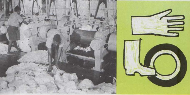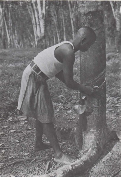 Los hombres que trabajan en la plantación utilizan un cuchillo de forma curva para hacer un pequeño corte en la corteza del árbol del caucho. Instalan después un caño en cada incisión y ponen un recipiente debajo del caño. Esos recipientes, colocados en distintos árboles, se recogen una vez que el látex, cayendo gota a gota, los ha llenado. Después, el látex se carga en grandes camiones, parecidos a los que transportan la leche, para llevarlo a las fábricas de caucho. Allí se confeccionan botas de agua, neumáticos, etc.