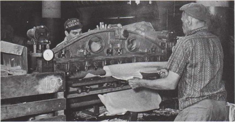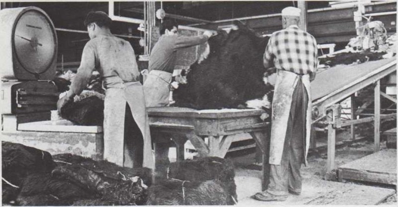 Los empleados de una tenería hacen muchas cosas con una piel de vaca antes de que se convierta en un cinturón de cuero. La limpian y la depositan en un recipiente lleno de productos químicos, como el tanino, que transforman la piel en cuero. Una vez limpia, se pone a secar la piel, se estira y se suaviza, se la unta con aceite y se pule hasta convertirla en cuero acabado. Unas máquinas parten y dividen las piezas de cuero. Después, las cortan en tiras i fin de confeccionar cinturones.