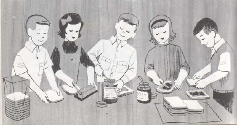 He aquí los elementos de una cadena de fabricación de sabrosos bocadillos: el primero saca la rebanada de pan del paquete, el segundo esparce mantequilla encima de ella, el tercero le pone una clase de mermelada, el cuarto le pone otra clase de mermelada y el quinto completa el bocadillo con una rebanada de pan. |
